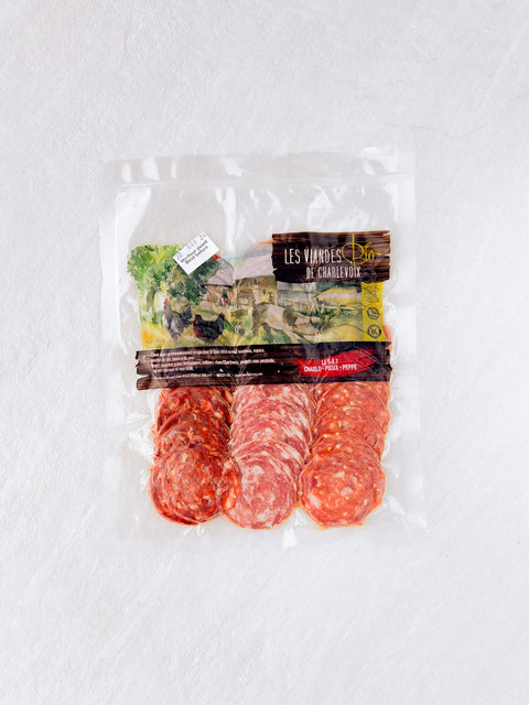 Ingrédients : Longe de porc*, sel de mer, poivre*, épices*. (*Biologique.)